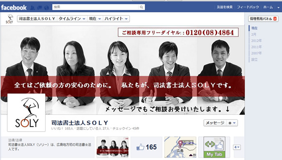 フェイスブックページが3月末で一斉にタイムライン化することが発表されました。それに合わせて当社でもフェイスブックページの再デザインを開始いたしました。以下は司法書士法人SOLY様のフェイスブックページ。カバー画像には司法書士の写真を使い、人の気配のあるページを意識しました。